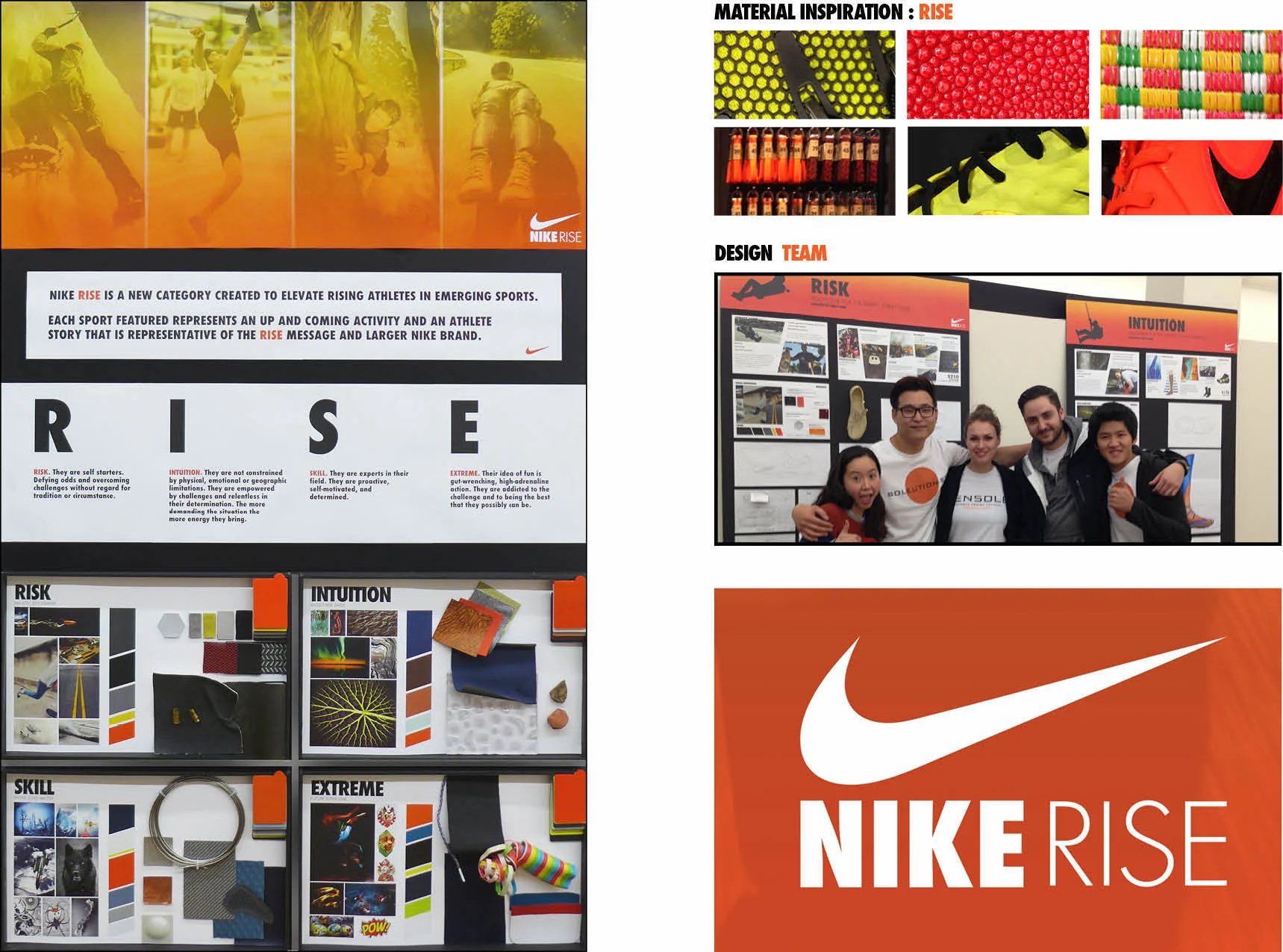 Nike RISE was a collaborative project executed by four designers during the 2014 Pensole Footwear Design workshop. Nike sponsored the effort, and the team was given free reign to create a project best suited to Nike’s core strengths and interests. Based on emerging trends, we formed a new sub brand promoting the rising stars in new extreme sports. As the Color + Material Design lead, I created the new brand identity and CMF platform to support my team of footwear designers.